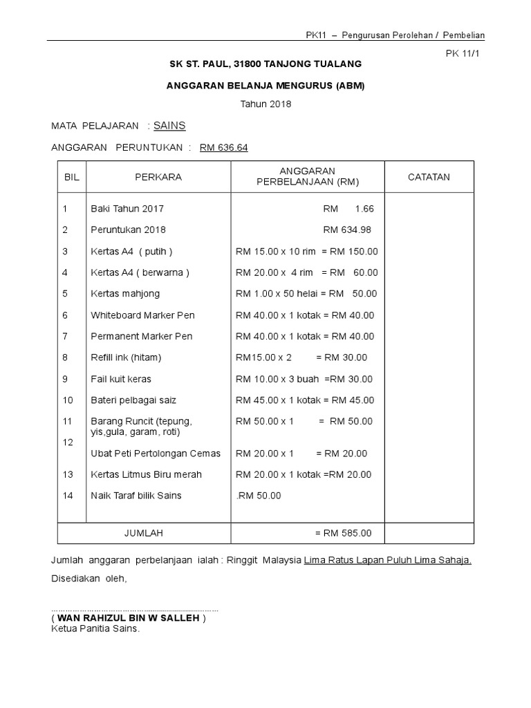 Anggaran Perbelanjaan Panitia Sains Pdf Document