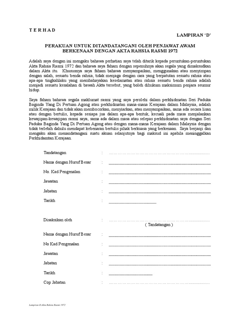 Akta Rahsia Rasmi Pdf Terhad Lampiran U2018d U2019 Perakuan Untuk Ditandatangani Oleh Penjawat Awam Berkenaan Dengan Akta Rahsia Rasmi 1972 Adalah Saya Course Hero