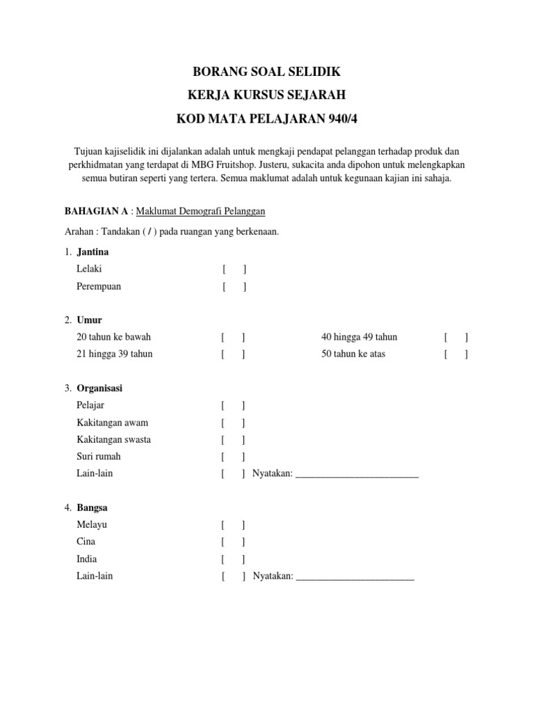 Contoh Borang Soal Selidik Kajian Kes Sejarah