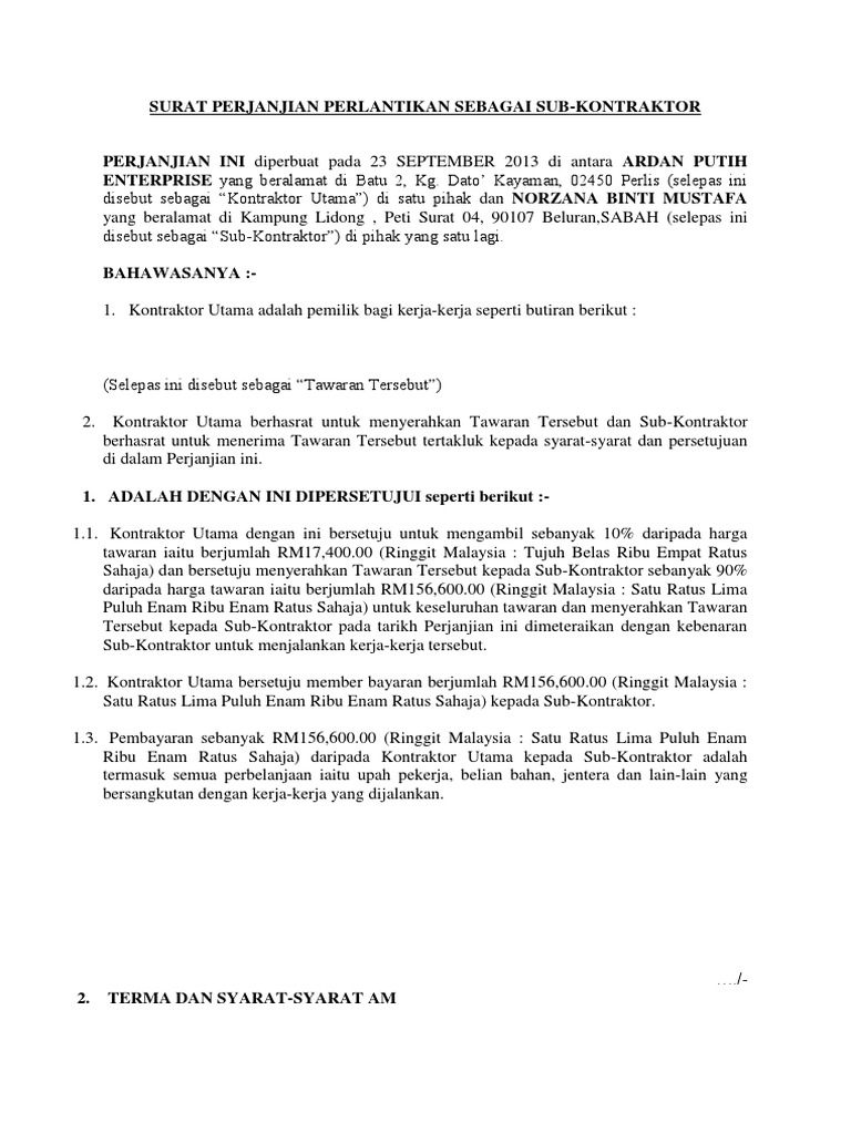 Surat Perjanjian Perlantikan Sebagai Sub Kontraktor Docx
