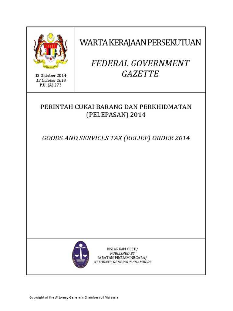 P U A 273 Perintah Cukai Barang Dan Perkhidmatan Pelepasan 2014
