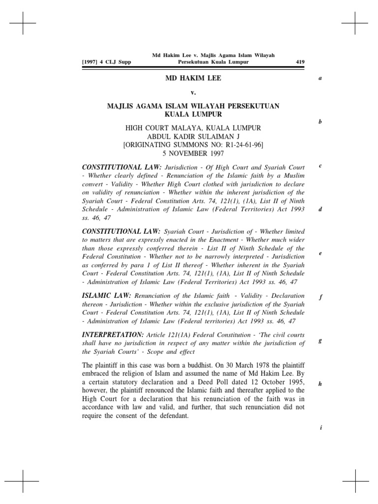Md Hakim Lee V Maiwp Kl Sharia Jurisdiction