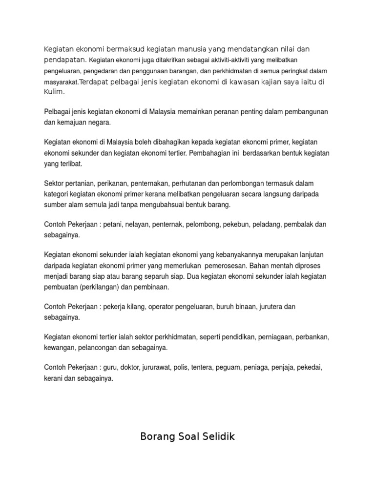 Pelbagai jenis kegiatan ekonomi di malaysia memainkan peranan penting dalam pembangunan dan kemajuan negara. Kegiatan ekonomi utama aktiviti ekonomi malaysia terdiri daripada berbagai bagai sektor. 12 2 1 kegiatan ekonomi utama sebarang kegiatan manusia yang mendatangkan nilai pendapatan sekaligus membantu menjana sumber kewangan dan membuka peluang pekerjaan jenis kegiatan ekonomi. Sektor sektor tersebut boleh dibahagikan kepada tiga bahagian iaitu sektor pertama sektor kedua dan sektot ketiga.