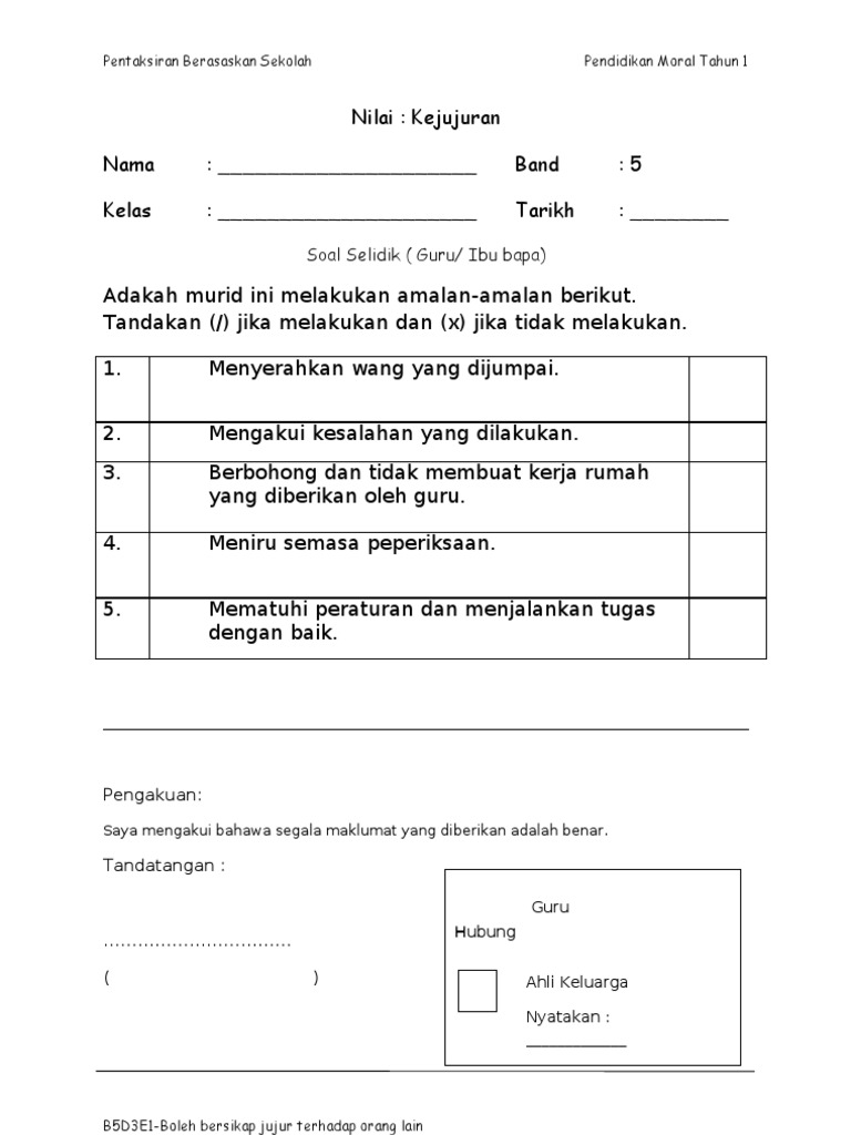Insrument Pbs Kssr Pendidikan Moral Tahun 1 Kejujuran Band 5