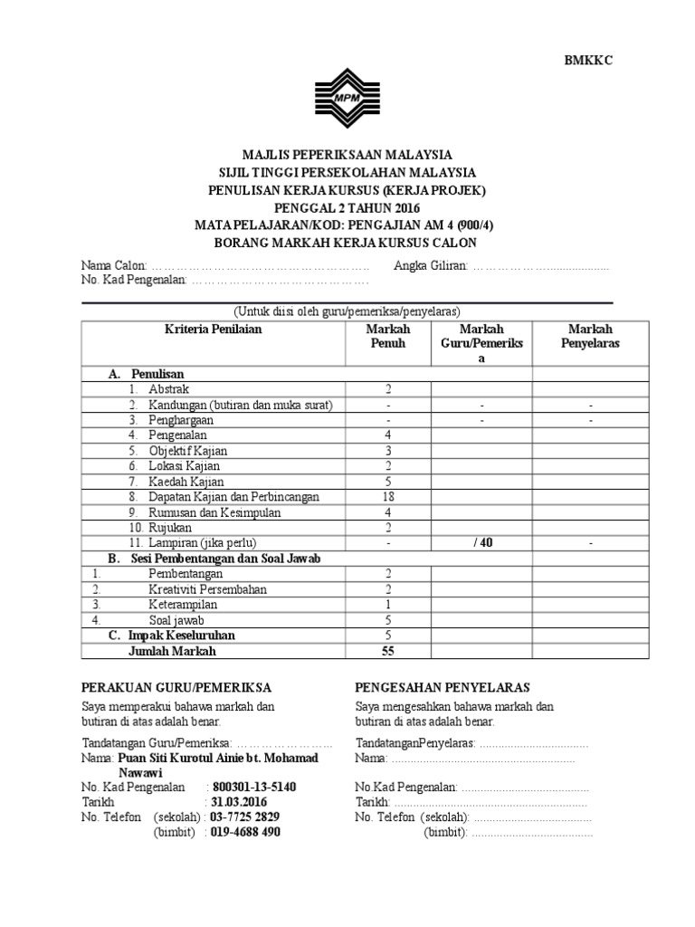 5 7 4 borang markah kerja kursus calon bmkkc lampiran 4 5 7 5 borang rumusan markah kerja kursus calon brumkkc lampiran 5 5 7 6 kerja kursus pengajian am. Tarikh aktiviti dalam penghasilan projek ulasan guru tandatangan guru tandatangan calon pemberitahuan cara menulis pbs. 58 lampiran borang temubual kerja kursus pengajian am kod mata pelajaran 900 4 makluman kepada responden. Nilai yang akan diperoleh bagi setiap peperiksaan penggal dan kerja kursus akan ditambah seperti contoh di bawah.