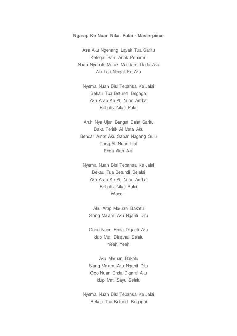 Lirik Lagu Ngarap Ke Nuan Nikal Pulai Masterpiece