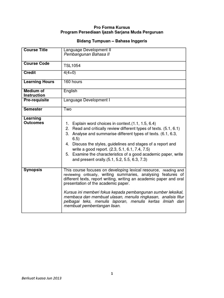 Pro Forma Tsl1054 Language Development Ii Ppismp Tesl Semester 2 English As A Second Or Foreign Language Abstract Summary