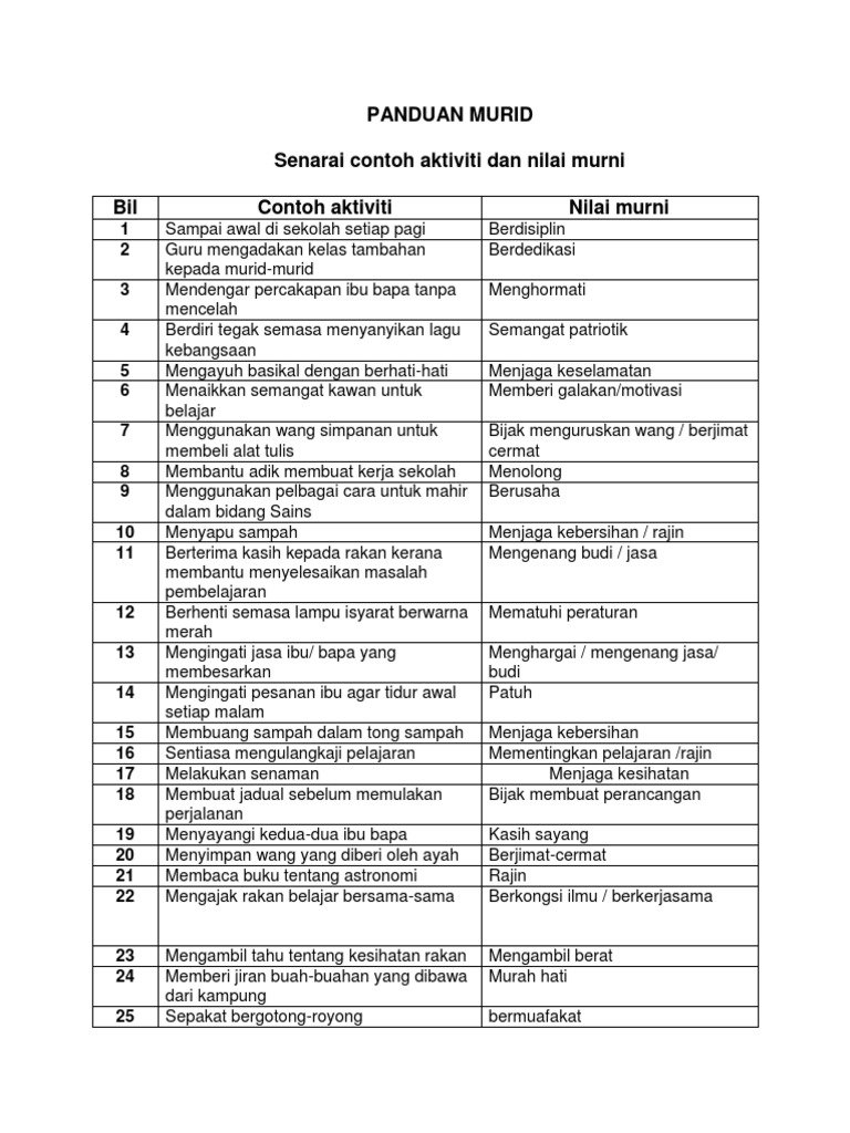 Senarai Nilai Murni Dalam Subjek Bahasa Melayu
