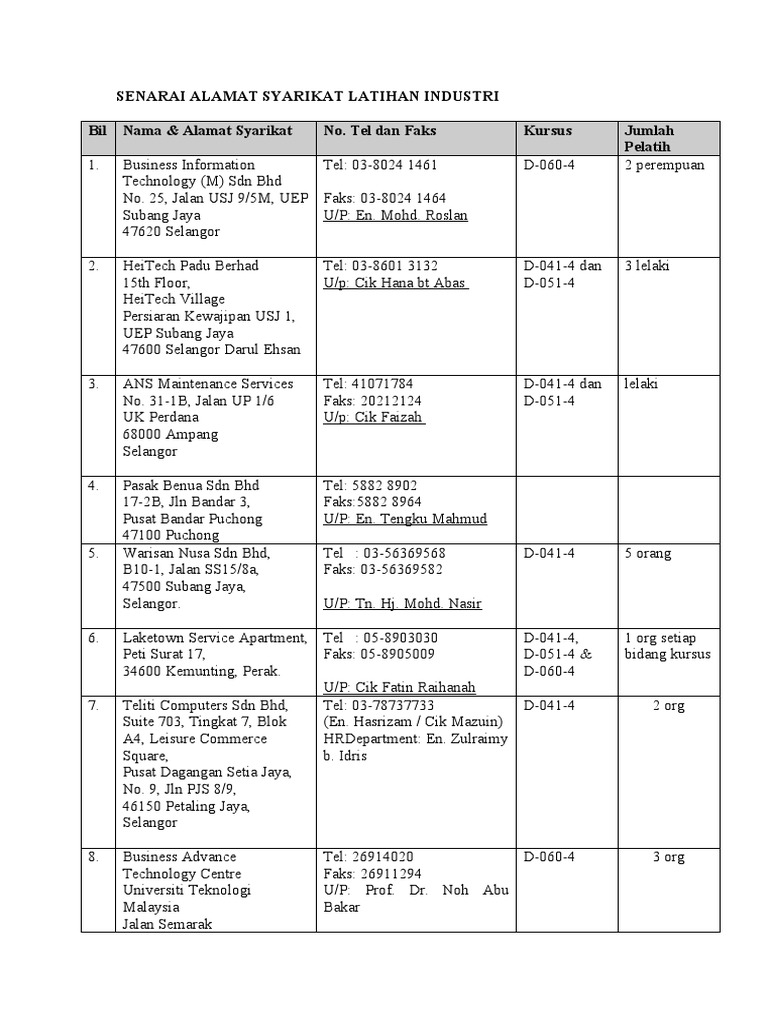 Senarai Alamat Syarikat Latihan Industri