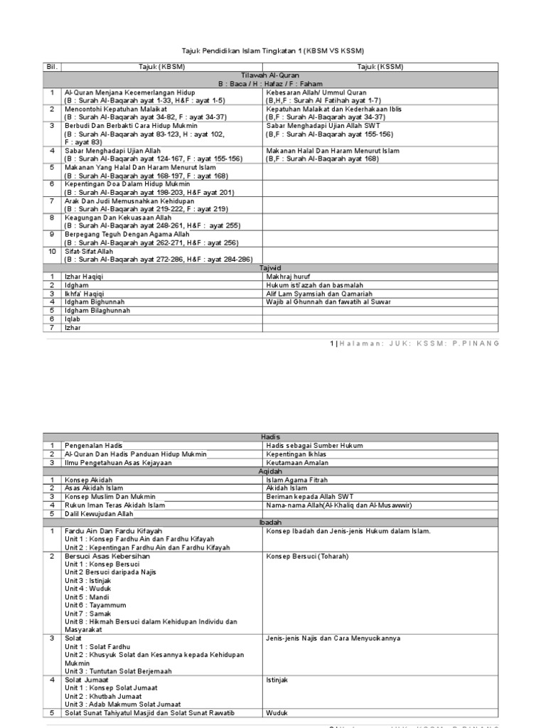 Doc Tajuk Pendidikan Islam Tingkatan 1 Kbsm Vs Kssm Bil Tajuk Kbsm Tajuk Kssm Tilawah Al Quran Jabar Sedek Academia Edu